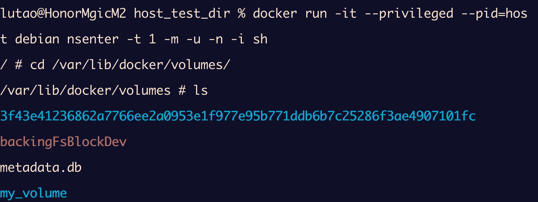 还记得我们之前使用过的docker volume inspect my_volume命令得到的路径结果"Mountpoint": "/var/lib/docker/volumes/my_volume/_data"