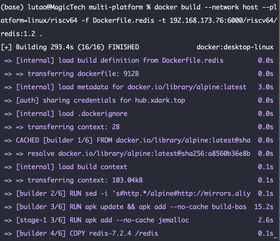 4.构建跨平台镜像。这一步本质上用到了buildx和QEMU,但是Docker Desktop为我们把这些底层都封装了起来,所以如果你是用Docker Desktop启动的Docker就不用在意;构建的同时如果遇到网络问题,请在参数中添加--network host命令,这会将宿主机网络作为容器内部网络,绕过网络限制。这个解决思路来自于stackoverflow