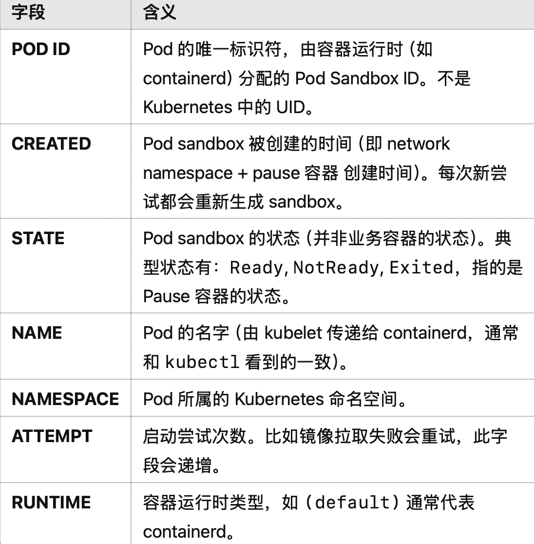 而其中的state完整结果其实是SANDBOX_READY,又证实了我们之前说的,crictl获得的是Pod sandbox。